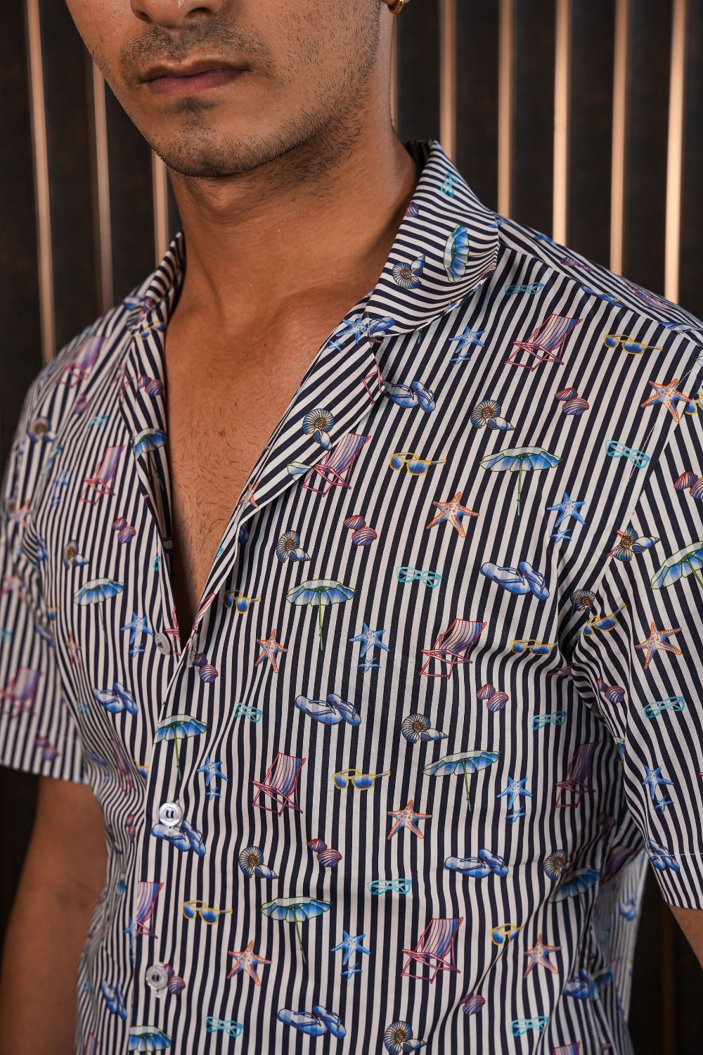Navigate style in sync with the Pixel Pilot Cotton Co-ord Set — a matching short-sleeve shirt and relaxed pants crafted from breathable cotton. Featuring vertical black-and-white stripes interrupted by pixel-inspired blue and pink blocks, this set channels digital nostalgia with modern edge. Perfect for lounge edits, airport looks, or campaign shoots with a glitchy twist.